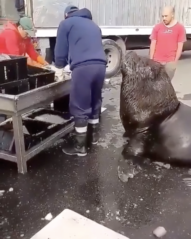 Thrilled by his generosity and hoping it would continue, the sea lion followed the man’s every move, waiting and waddling along beside him until he finally offered him more fish. All around them, people continued to work, and the man tried to follow suit and be as productive as possible — all while navigating around the huge, famished sea lion.