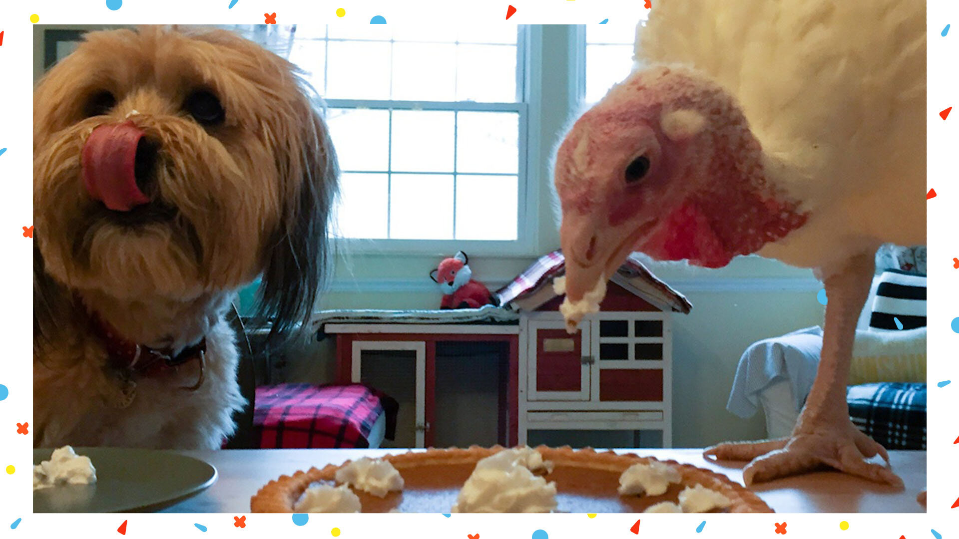 When Blossom the turkey was a little baby, she came to stay at Minnow the dog’s house — and they decided they were going to live together forever!