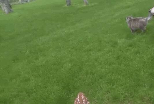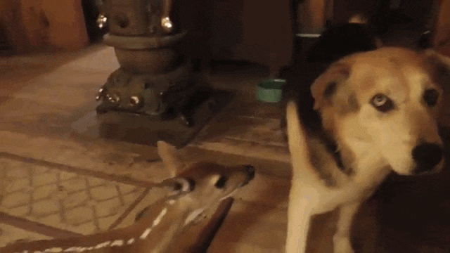 So, Darius brought the fawn into his house. And although the fawn found herself right at home, Darius' pets didn't quite know what to make of her.