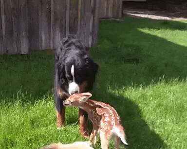 She formed a special relationship with one of the dogs, Mack, who repeatedly licked the fawn's face.