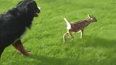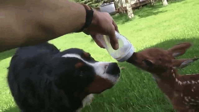 The fawn didn't realize it yet, but Darius would become a lifesaver. He used an oatmeal box as a splint to help her leg grow stronger.YouTube/honeysadaHe also nurtured her while she healed, feeding her every four hours.YouTube/honeysada"I had to do some Internet search and reading to be able to understand how to [raise] a fawn ... get up at night to feed her every four hours, and clean her after," Darius said.And soon, she once again learned to walk on an even keel.YouTube/honeysadaAnd her spirits began to lift.YouTube/honeysadaShe formed a special relationship with one of the dogs, Mack, who repeatedly licked the fawn's face.YouTube/honeysadaMack's parental instincts kicked in, and he stepped in as a foster dad, becoming the most "helpful" during feeding times.YouTube/honeysada"Mack was [a] big help" Darius said about his colleague's 1-year-old [Bernese] mountain dog, "because he just loved her and cleaned her so good."As the fawn made her way toward a full recovery, Mack kept a close eye on her and never let her run off too far when they'd go outside to play.YouTube/honeysadaAfter lots of hard work, the fawn's legs had returned to full functionality. It was time to set her free.YouTube/honeysada"She's already used to me, and she follows me," Darius narrated in the video. "But nobody can replace her real mom."YouTube/honeysadaDarius brought the fawn out many evenings to release her with a deer family in the wild, but she always returned ...YouTube/honeysada... until one night, when the deer spotted her mother and joined her family once again. Darius' job was complete as a wildlife rehabilitator. YouTube/honeysadaMonths later, he encountered the fawn once again, and what he witnessed was a confirmation that he did a job well done.The fawn leapt through the brush alongside her family.YouTube/honeysada"Since day one I was hoping to release baby deer back to the wild," Darius said. Over the course of her two-week stay, the deer went unnamed - Darius wanted to avoid becoming too close to her, since he knew he'd have to let her go."I really hoped that she did not get attached to me too much," he said, "because that would make [it] very hard for her to survive in the wild. She would become [an] easy target for hunters and predators." The wild is full of very real dangers for a deer, but Darius knew that the wild was also where the fawn belonged."[I've] seen [the family] many times after release, also seen them recently in the fall," he said. "The mother deer usually does not go too far from the place where she feels safe, so she stays around the area."He concluded in his email, "It is [a] very, very good feeling seeing them safe roaming around."It's a good feeling knowing that there are compassionate, thoughtful people like you, Darius.If you have 17 minutes, there are few better ways to pass that time than by watching the full video below.